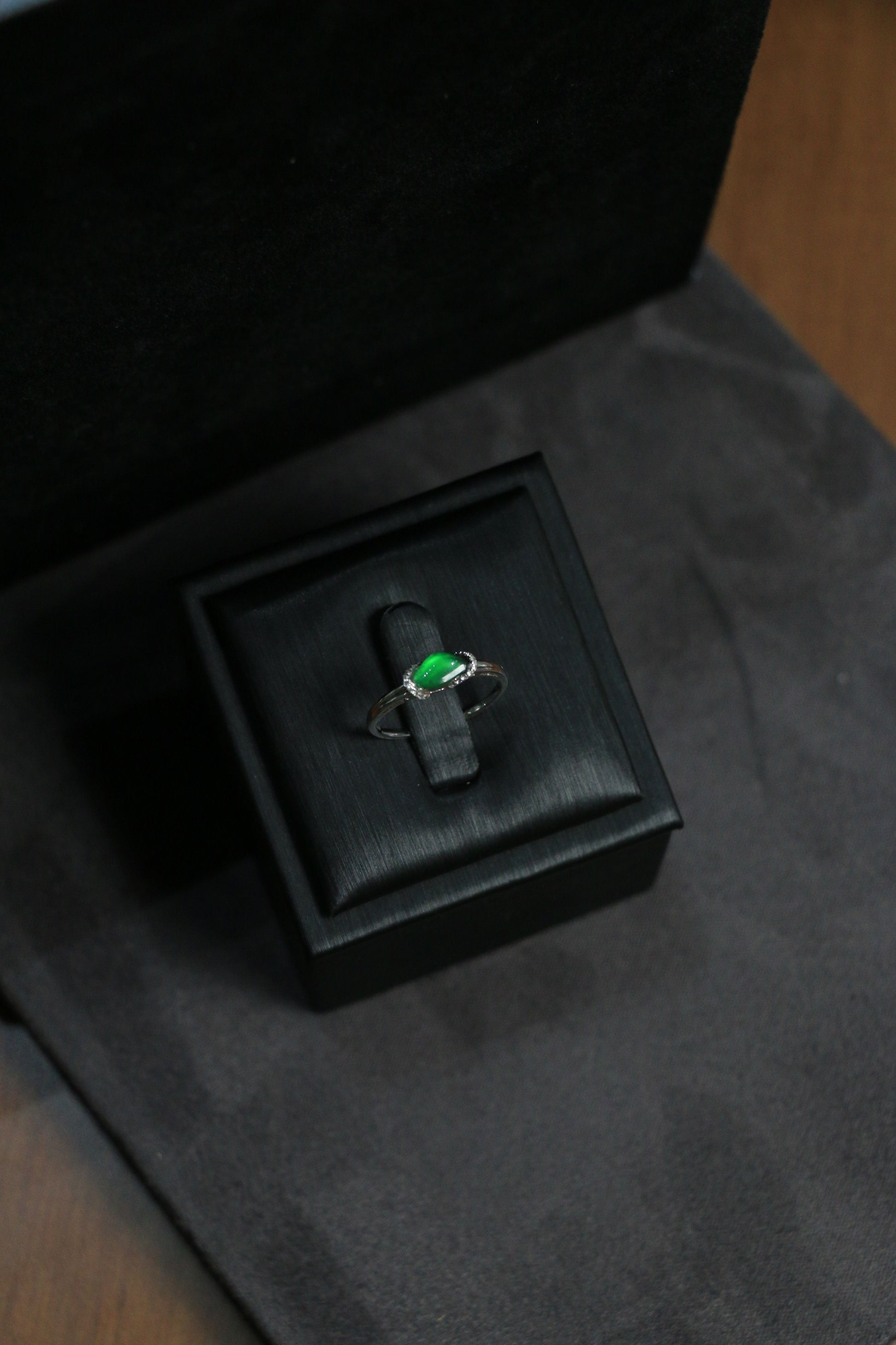Setting: Prong-set jade cabochon with diamond halo